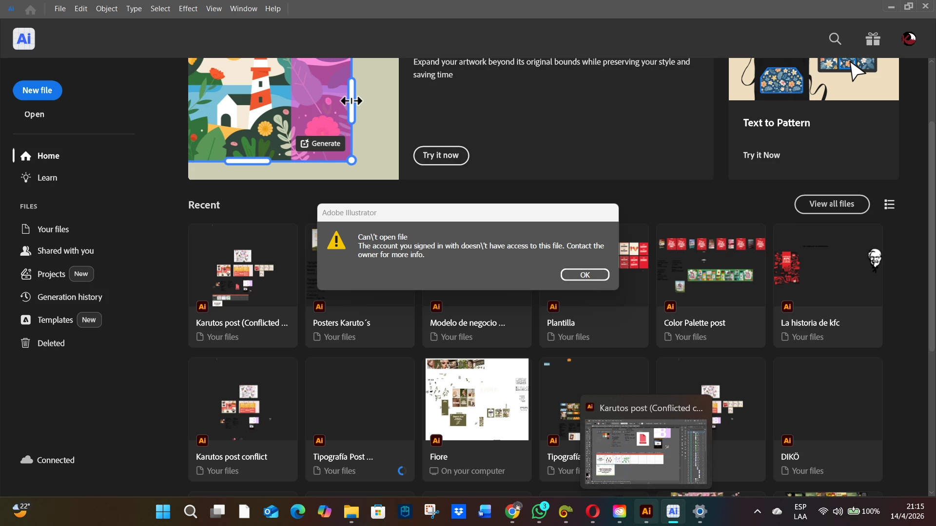 I made some illustrator files several months ago and saved them to the cloud. Now I am trying to open them and it says "Can't open file. The account you signed in with doesn't have access to this file. Contact the owner for more info." I am the original creator and I have an adobe account using one email that has both a personal account and a school account (which I can't remember if I've ever used this). The files appear in-app under "Your files" but if I go to assets.adobe.com it says "You have no cloud documents." Since I made them I've gotten a new computer and my original subscription ended and I am currently on a 7 day trial on my personal account. Also I'm a student and my institution paid for the subscription originally. I don't remember if I made the files after being signed into a personal account or a school account. When I'm signed into my school account if I try to go to assets.adobe.com I get: "Error 401: Unauthorized. You are not authorized to access this site." I'm just trying to make small changes to these files and recreating them from scratch would take weeks. 😞