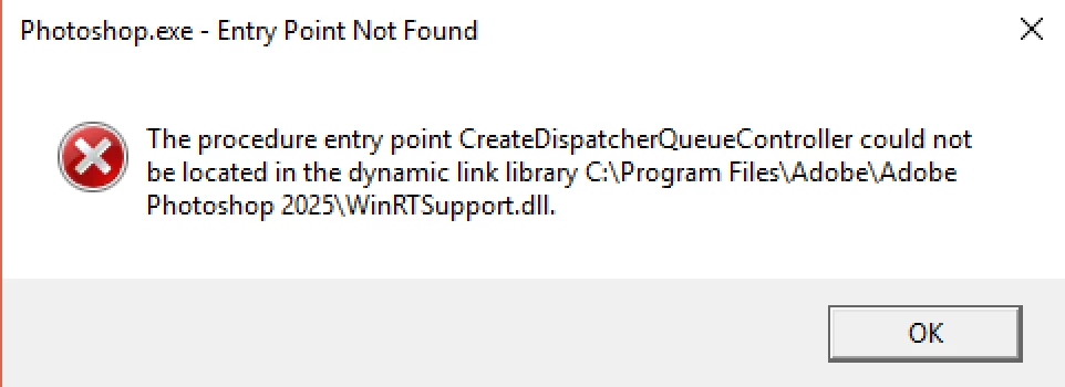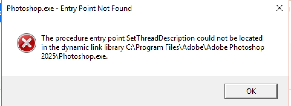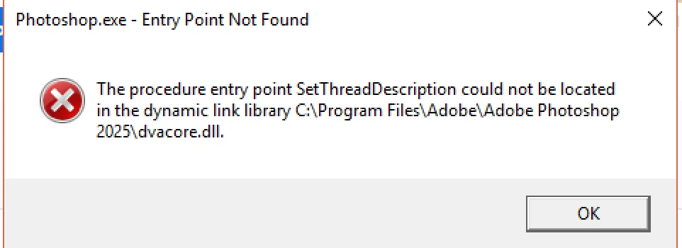 I downloaded the latest Photoshop version 26.10 but failed to launch it with "The procedure entry point SetThreadDescription couldn't be located in the dynamic link library c:\....\Photoshop.exe".