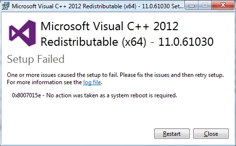 VC++ 2012 x64 can require a restart.  The Adobe installer is not designed to handle this situation.   If this is the issue in your case, rebooting will resolve it.