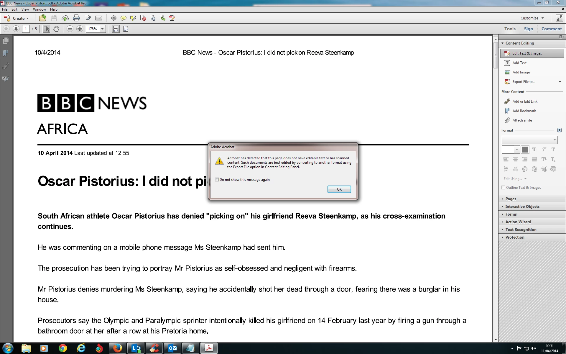 I have been unable to edit most of the PDF's using adobe acorbat xi pro and I end up getting attached error message when I try Edit option under Tools. Can you please advise ? OS - I have tried both win 7 32 and 64 bit. It works for few Pdf's but not for all.