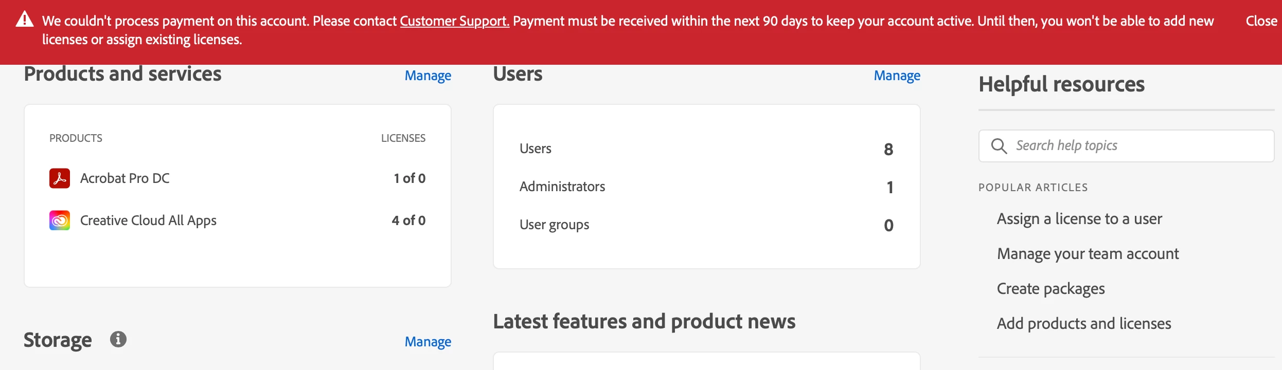 "We couldn't process payment on this account. Please contact Customer Support. Payment must be received within the next 90 days to keep your account active. Until then, you won't be able to add new licenses or assign existing licenses."