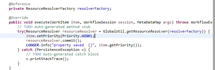 I am trying to save workflow priority by setting priority through workflow process step. However, the property is not getting set to the item even after commiting the change as per the below snippet. In crx/de it still shows the priority as 0(which is 'MEDIUM'). Any suggestions here please.