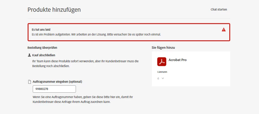 Weitere AdobePro Lizenzen über die Admineconsole beziehen fehlgeschlagen - Fehlermeldung
