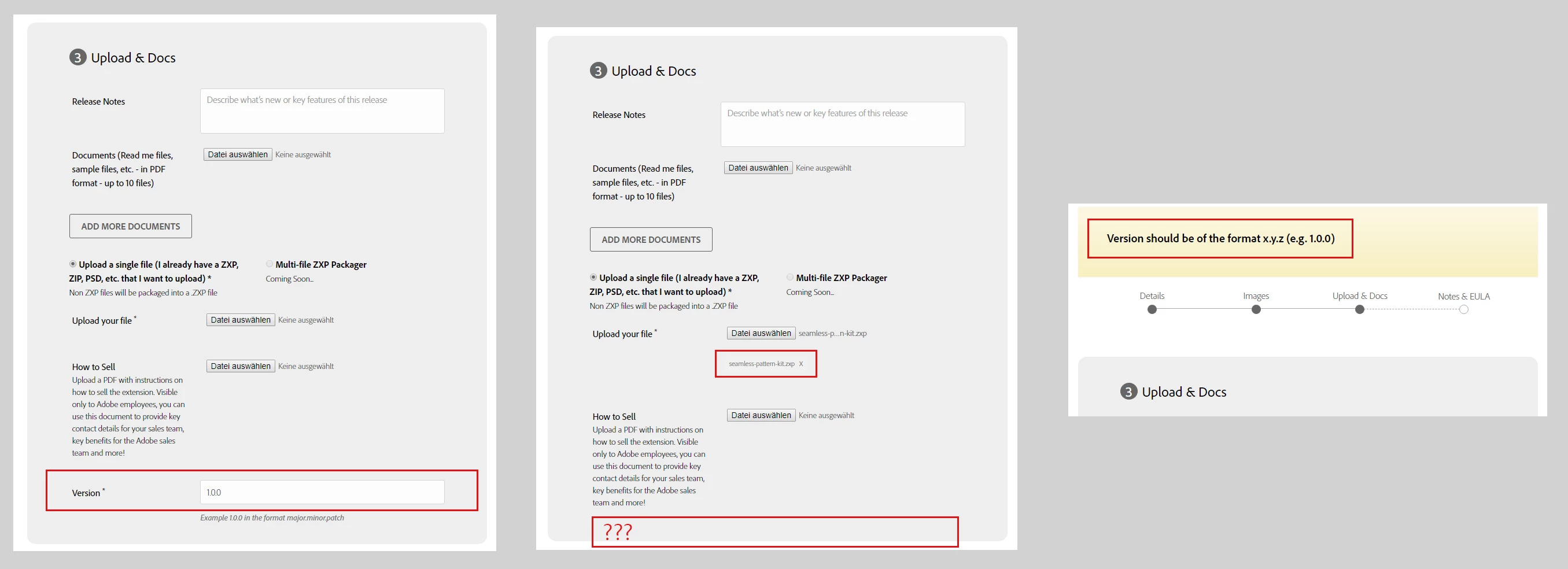 The first to steps of the "create listing" form (Details and Images) are no problem. But at Step3 (Upload & Docs) it keeps telling me that the version format is incorrect.