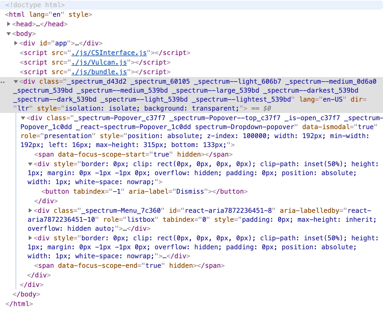 This might have more to do with CEP than React Spectrum, but the Picker dropdown does not open in my CEP panel. Strangely it works if I have the debugger open in localhost, but if I close that localhost and just try it in the CC product, the dropdown stops working. I narrowed it down to a div being appended to the body. If that div gets appended, the dropdown works. I highlighted it in this screenshot: