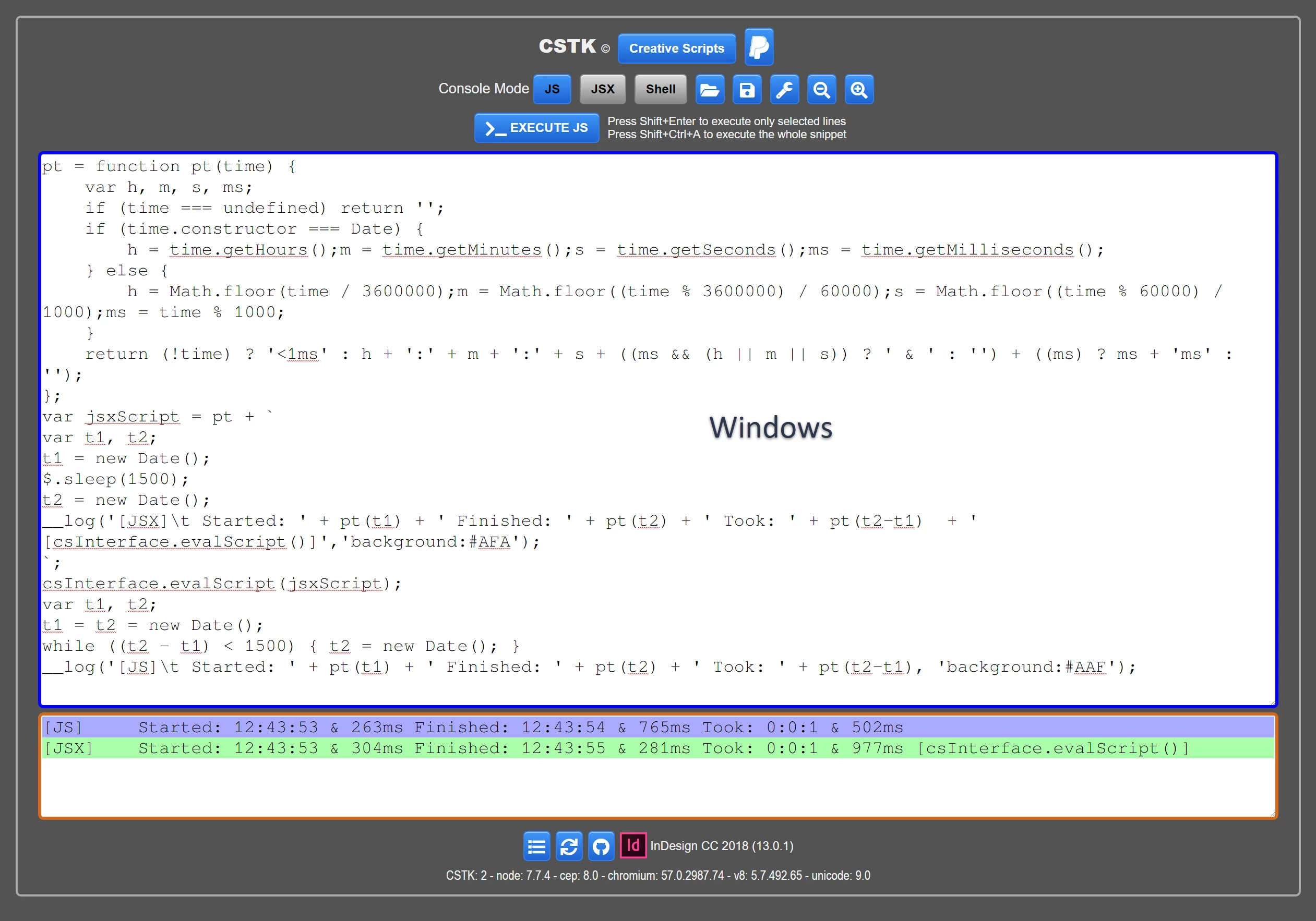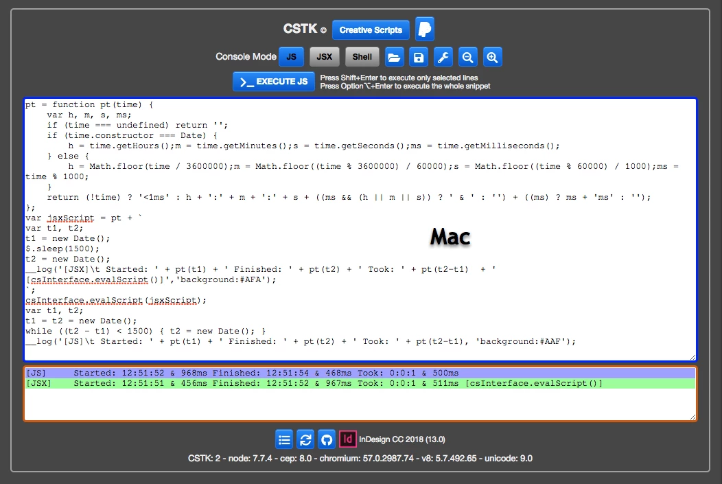 Trevorׅ wrote If you look at the Windows screenshot you can see that the JS execution is not halted by the JSX execution (Asynchronously). On the Mac you can see that the JS execution is halted by the JSX execution (Synchronously). |