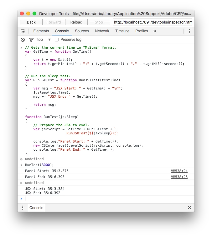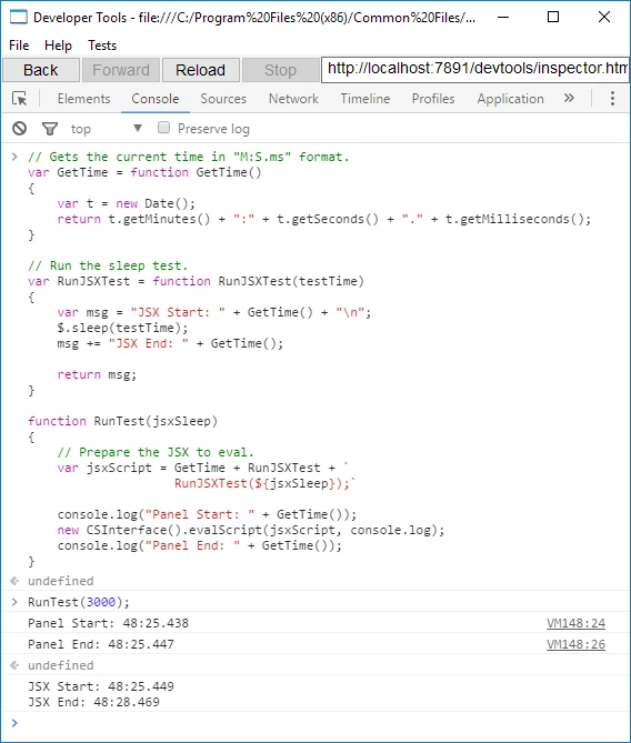 Which will cause the JSX thread to sleep for 3 seconds in between a bunch of print statements. This is simply an expansion of the testing code I provided here. In addition to a noticeable pause during execution, this version will show you timestamps of each call.