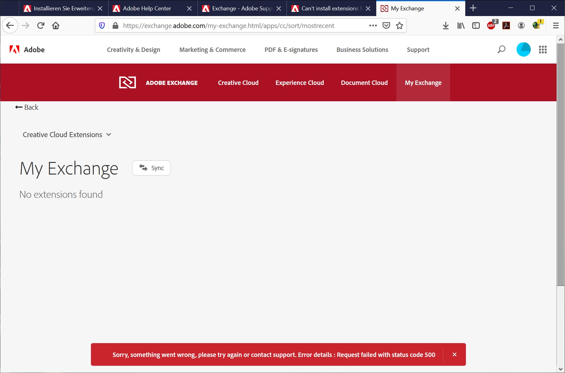 I have problems to get the Extension manager working. Configuration of Adobe Cloud Desktop App shoud be fine, but at Adobe Exchange i get an immediate Error when acessing it for installing an extension (see screenshot). So i stuck at this point and can't go on with it.