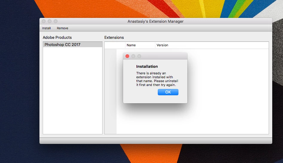 i'm unable to install .zxp file in adobe photoshop cc 2017 plz help...i try both zip installer and adobe extension manager cc for installing file but unable to install plz help