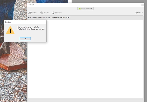 Working in Adobe Acrobat Pro DC, Print Production, in Preflight analyze and analyze fix - Receive popup “Not Enough Memory”