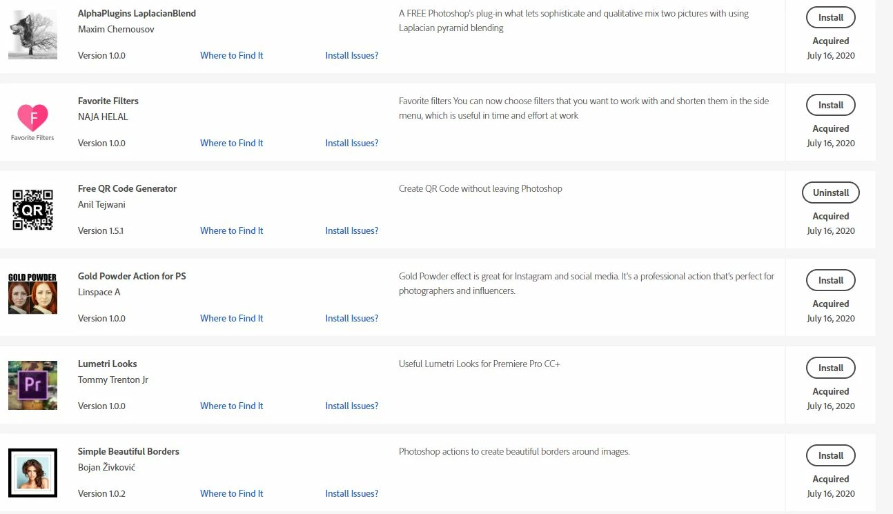 The Adobe MyExchange page shows every single add-on/extension I've ever downloaded / tried for my CC Apps till now. I am referring to this page - https://exchange.adobe.com/my-exchange.html