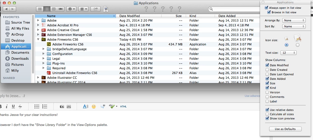 In that folder, find the Preferences folder. Then in the preferences folder, find the file with this name (or similar): "com.adobe.Fireworks.12.0.0.plist" and delete it.