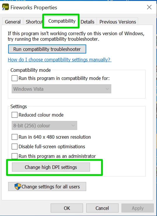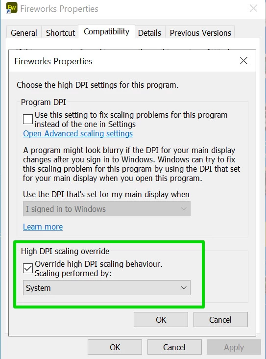 I think you want to right click on the Fireworks shortcut icon and choose Compatability => Change High DPI Settings ... then choose override high DPI settings and select 'system' .... See screenshots: