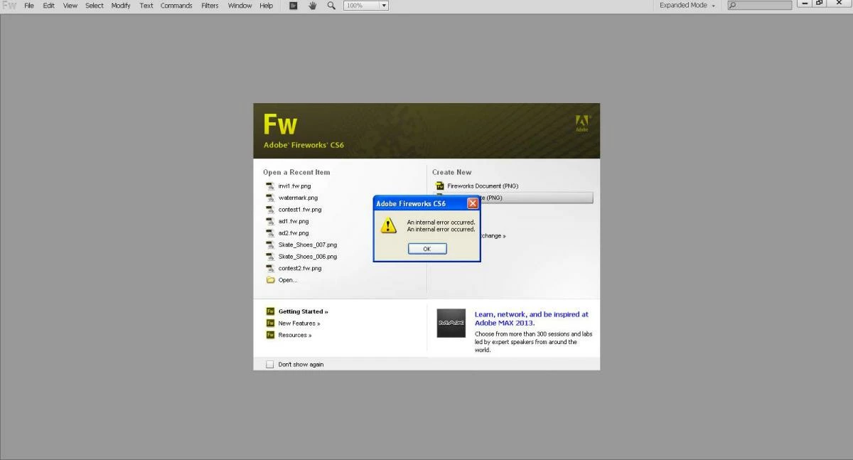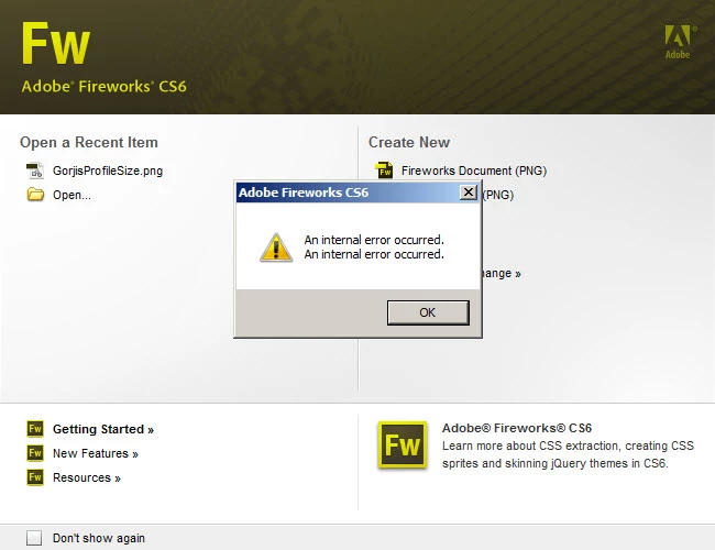 Everytime I try to open Fireworks CS6 (latest version of Master Collection and all updated), it refuses to run and a small pop up dialogue opens to say: An internal error occured. The pop up message cannot be removed. Each time I click it, it simply returns and I have to CTRL ALT DEL to shut down Fireworks.