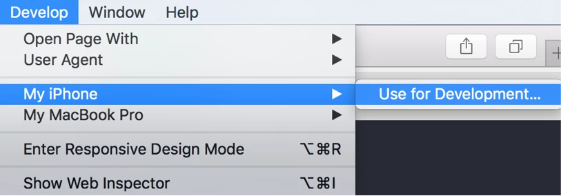 5. After Web Inspector is enabled, connect your device to your desktop machine with a USB cable. The name of your device appears in the Develop menu of Safari.
