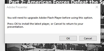 Click "Publish" in Adobe Presenter and get this error message. Flash is installed on my browsers, but can't get past the error message to use the product.