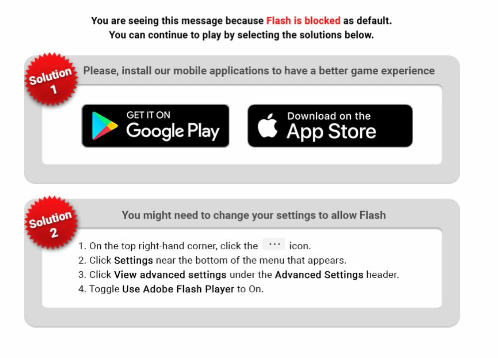 Games won't open. Says Flash Player is blocked. Followed steps to ensure it is on, it is. I use Microsoft Edge which has Adobe Flash Player integrated in it so it won't let me download it again. I play two games on FB, Gin Rummy and Spades, they won't open because Adobe Flash Player is blocked.  It is on under settings.  Any advice?
