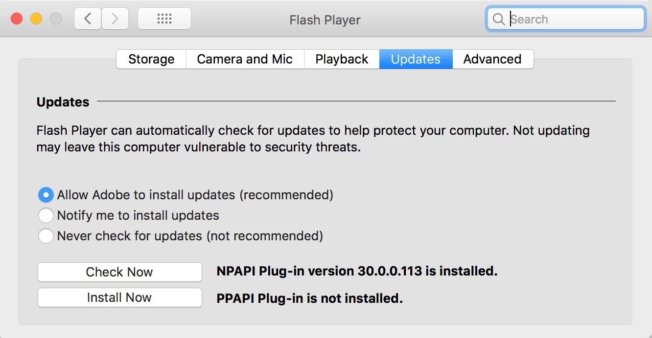 Version is 30.0.0.113 and the PPAPI plug in version is 30.0.0.113 both installed; the settings are set to allowAdobe to install updates.