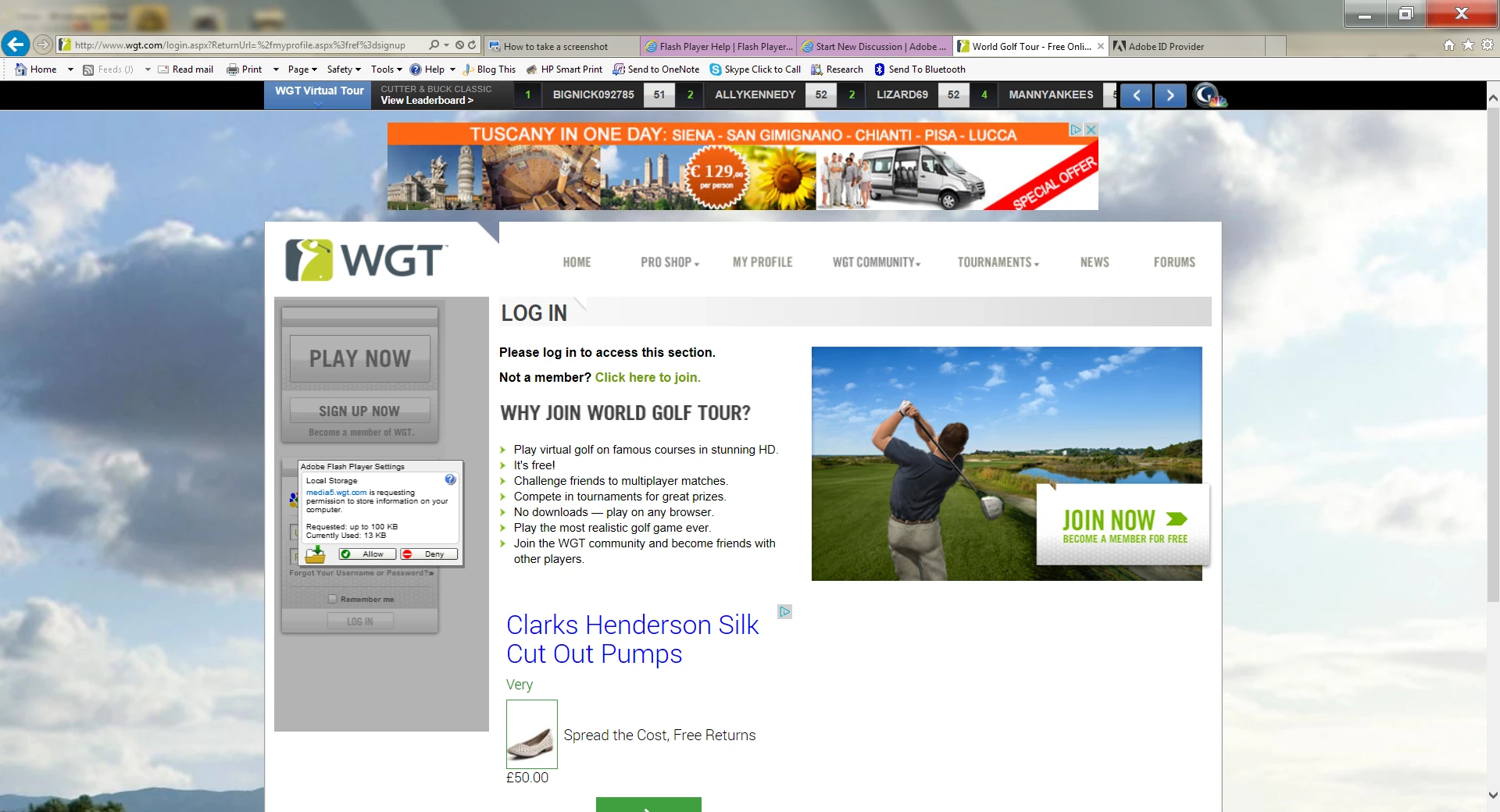 I play an online golf game at WGT (World Golf Tour), which has operated fine using the latest IE browser, until an Adobe Flash Player icon appeared on my login/play screen (sse screen grab below). It appears that the operators of the game MEDIA5.wgt.com want to increase the amount of information stored from 13 KB to 100KB. Unfortunately the icon buttons to allow (or deny) does not appear to work, so I am unable to remove the icon from the screen and enter the WGT site to play.
