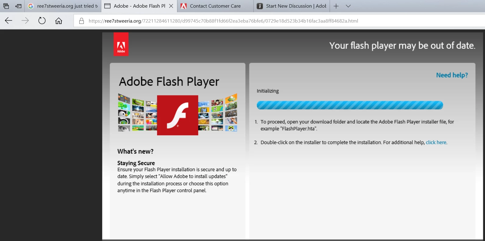 I acknowledged an update for Adobe Flash Player on my computer via Microsoft Edge. Then, I noticed the URL, which was: ree7stweeria.org (see screenshot below). Should I be concerned? NOTE1: Flash Player was NOT on my computer previous to this and I have verified that it still is not installed (Control Panel > Programs > Programs and Features). NOTE2: No threats found by Norton Security Quick Scan.