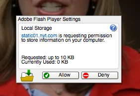 I have recently installed AdobeFlashPlayerInstaller_17au_ltrosxd_aaa_aih.dmg on mt Mac 10.10.2. When I open a web video on Safari I now get an annoying box in the center of the picture that asks that the site "is requesting permission to store information on your computer". There is an "Allow" and a "Deny" button. When I click 'deny' nothing happens and I cannot close the box off my center screen. What's happening here and how do I fix this?