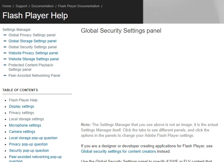 Flash player works but on the global settings website, the settings manager is invisible.