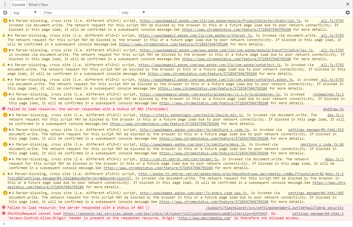 All extensions are disabled, same thing happens across multiple browsers. (Tried Chrome, MS Edge, IE11 and Firefox) seems to throw an error status of 403 across all browsers. Image of the console window throwing related warning and error messages (might help with resolving the issue):