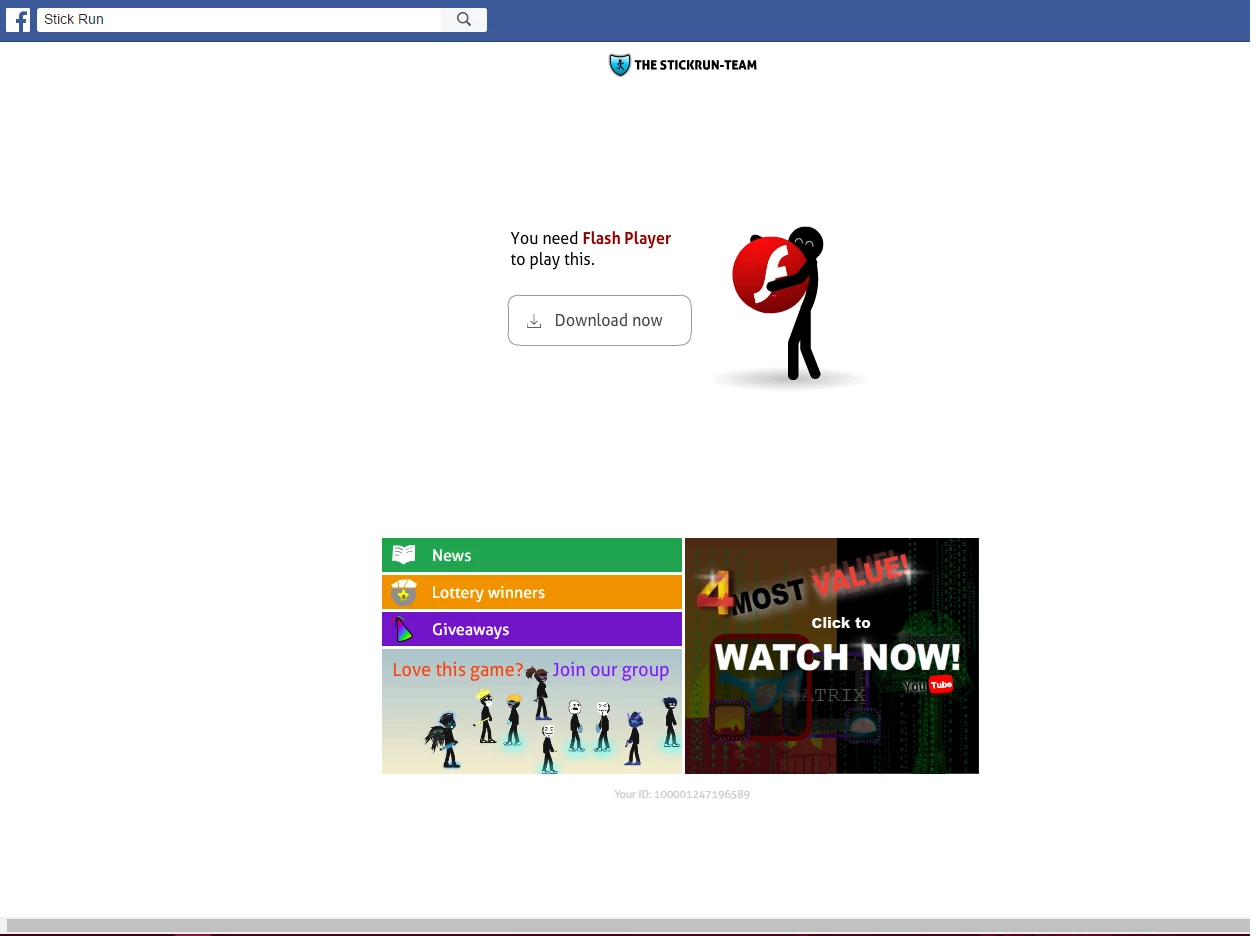 So.... 1 day I sing in to my facebook and I wanted to play this online game (Stick Run) because my friend wanted to play with me (I was playing this game before but it didn't ask me anything for flash player) when the page loaded the game  ask me that I needed flash player to play this...you can see the picture...)
