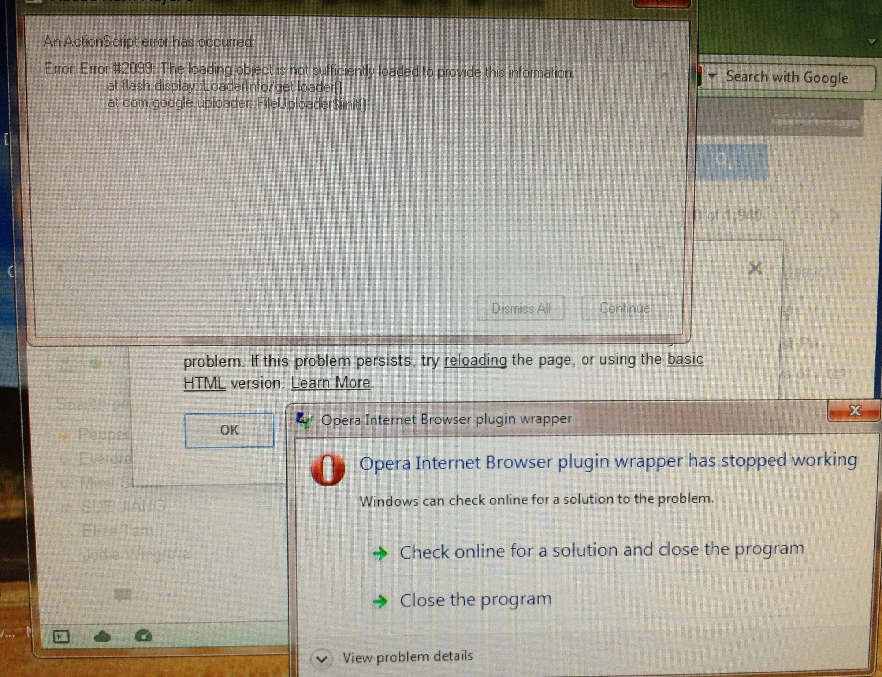 When logging on to gmail, the following errors popped up and then hanged Opera. Forced closing is required: