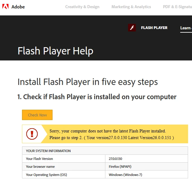 In addition, the version of the flash player fails to play the video of some sites, so we tried to uninstall and reinstall Flash Player, but the problem remains, and on the Adobe site the above message has been obtained.