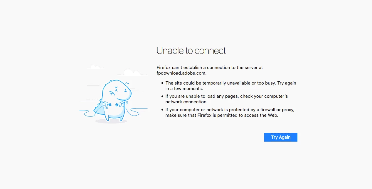 UPDATE: When I go to Flash Player help on Firefox it is telling me that Flash is not installed or enabled, but again when I try the below "Unable to Connect" box appears"