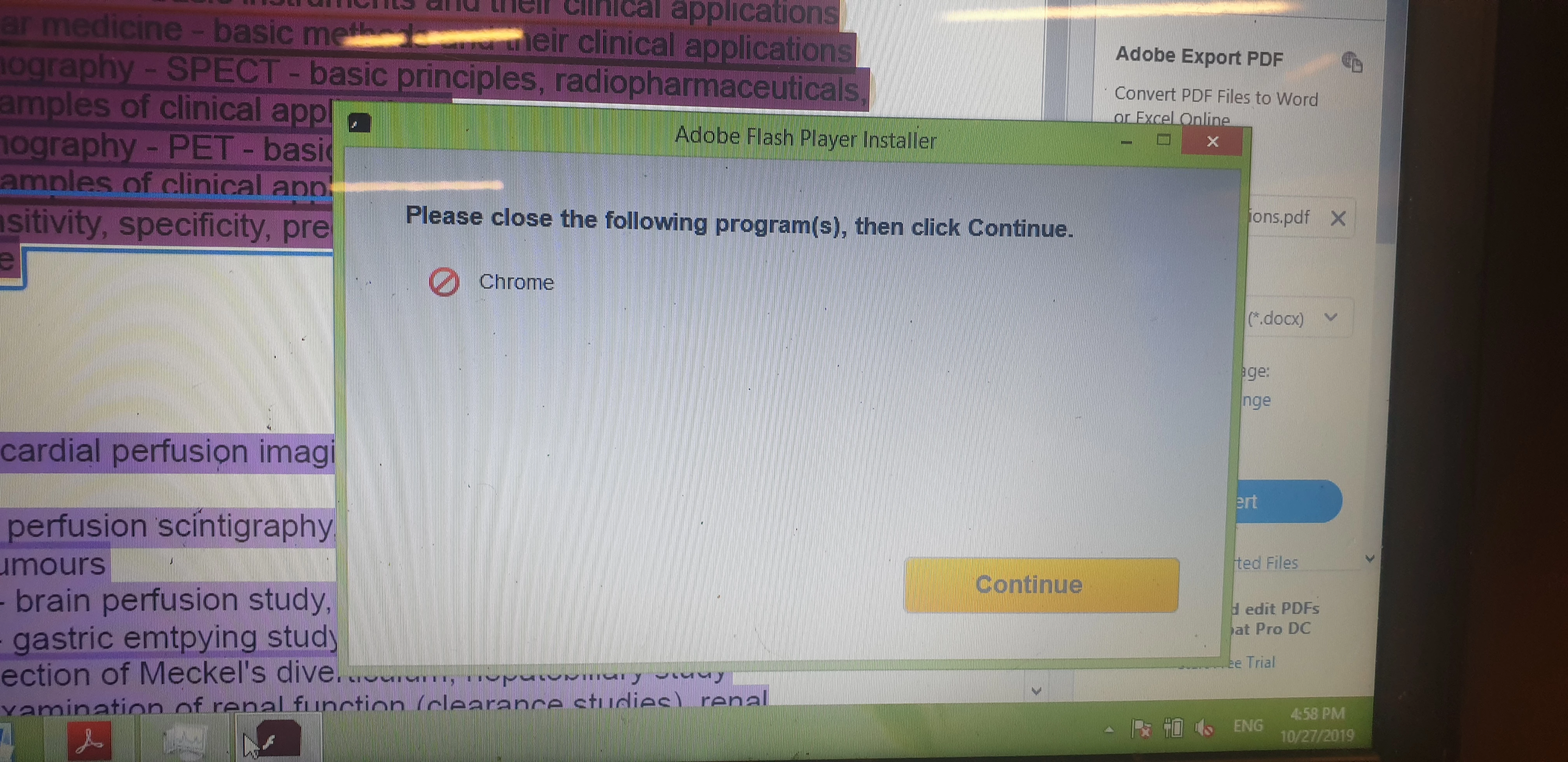 I am trying to install Adobe Flash on my computer (windows os) and it stops and asks me to close Chrome and press continue, it still doesnt work after i do that Ive contacted the online support they advised xlearing cache and cookies and trying to download again, and same error occured, please what can i do ?