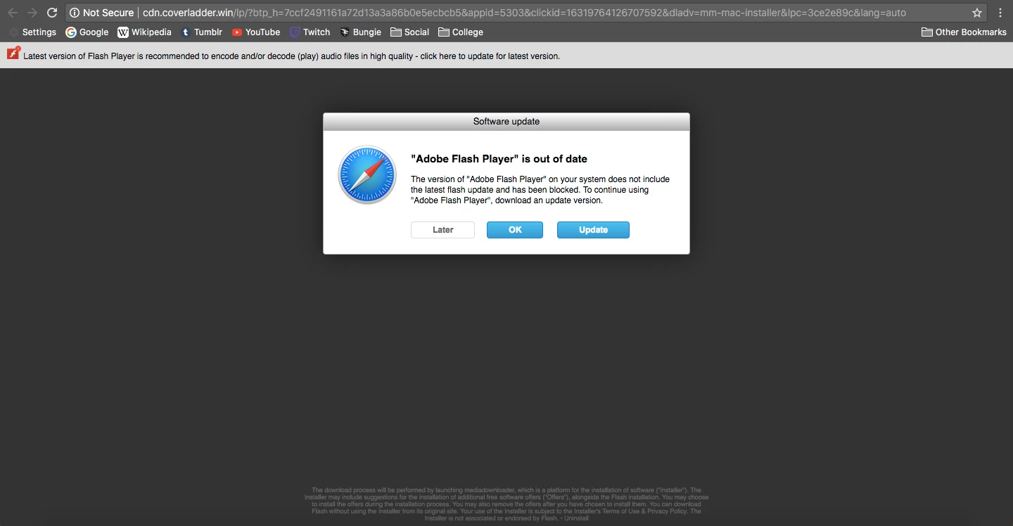 This "Adobe update" automatically wanted to download a disk image on my Google Chrome browser, luckily chrome asks before downloading and i canceled it.