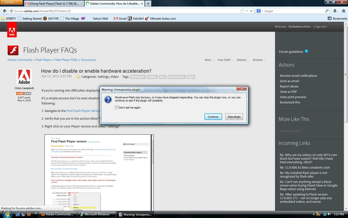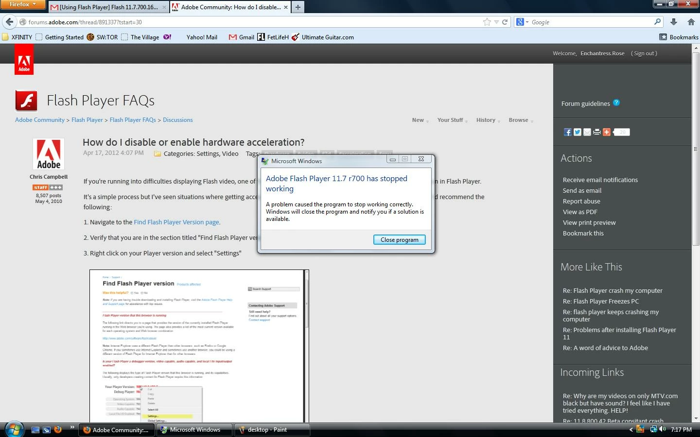 Anytime I open any program that uses the flashplayer, I get the pop up window of "Adobe Flash Player 11.7 r700 has stopped working", and then it force closes.