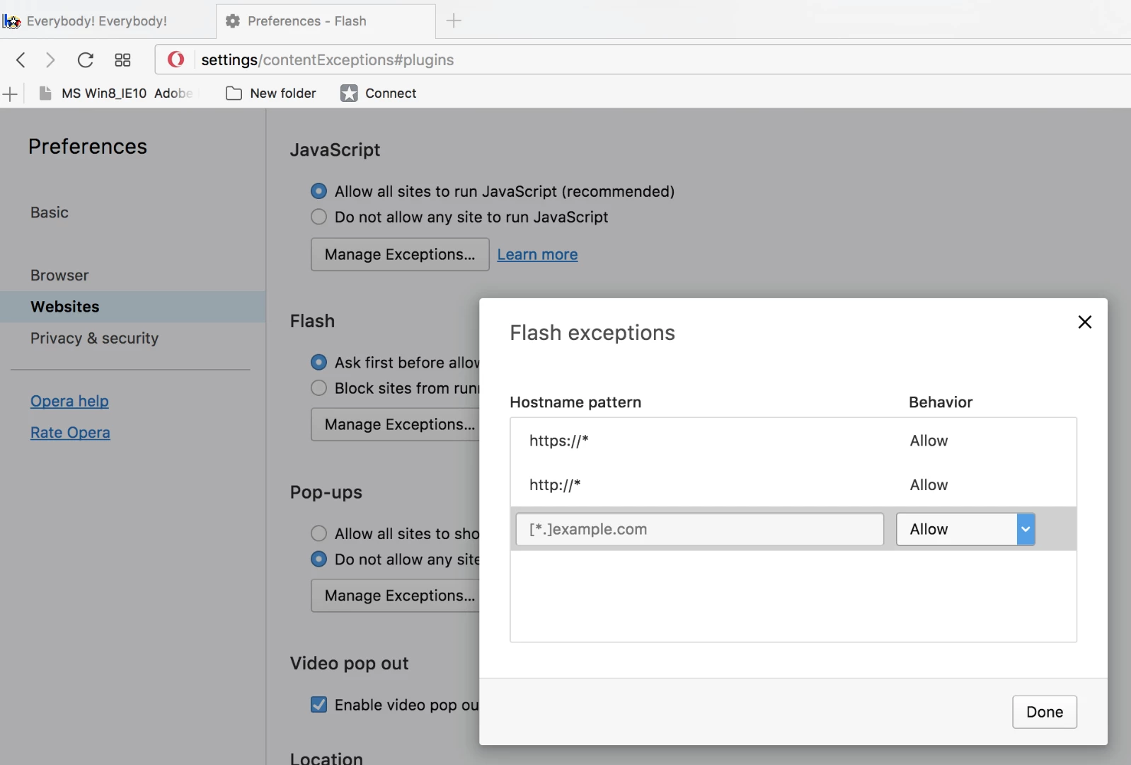 Adobe Flash Player Install for all versions this is the website I start the download from, I'm using Opera, though no other browser I've tried on this and two other computers have worked. Indeed, they all have the same issue. My settings are not set to block flash player and other than the one to block, there's only one other option available concerning flash player.