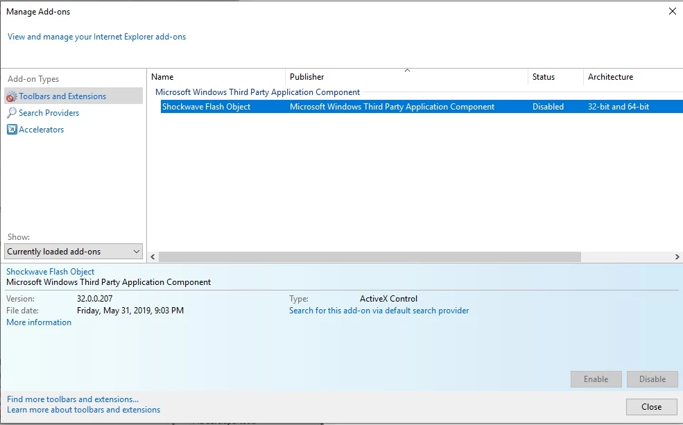 Flash Player does not work in Internet Explorer. In the instructions below, I can not perform step number five, because the "Enable" button is not active, as well as the "Disable" button.