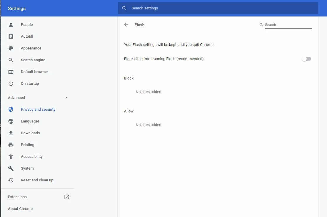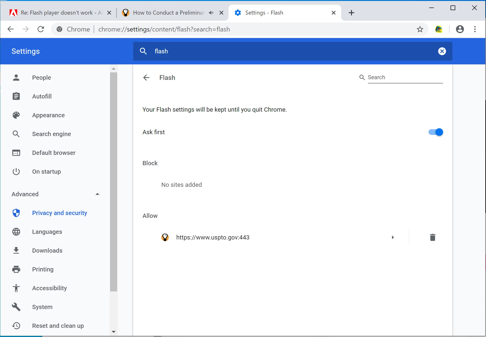 I am trying to run a flash document on the web site of the US Patent and Trademark (https://www.uspto.gov/patents-application-process/search-patents). I am running the Windows 10 OS and Google Chrome Browser. When I try to open the link, it tells me that "Adobe Flash Player is Blocked". I have checked in settings and it is NOT blocked. I was able to speak to someone at Adobe and they had me download and install the latest version but that did not help.