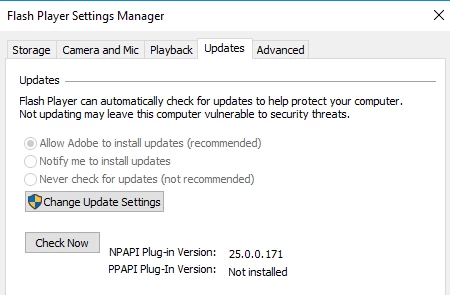 Hi, I have been prompted to update Adobe Flash player 22 Active X version 22.00.1.192 . I am using Windows 10 and have IE 11 installed but I very rarely use it. I thought that Windows 10 updated Flash player, I get updates for Adobe from windows 10. When I tested Flash player on IE 11 it said I had version 25.0.0.171 -up to date. In manage add ons I have Shockwave Flash object version 25.0.0.171 listed but no Flash player 22 Active X. In programs Flash player 22 Active X version 22.0.0.192 is listed and Flash player 25 NPAPI version 25.0.0171 but not Shockwave Flash object 25.0.0.71.