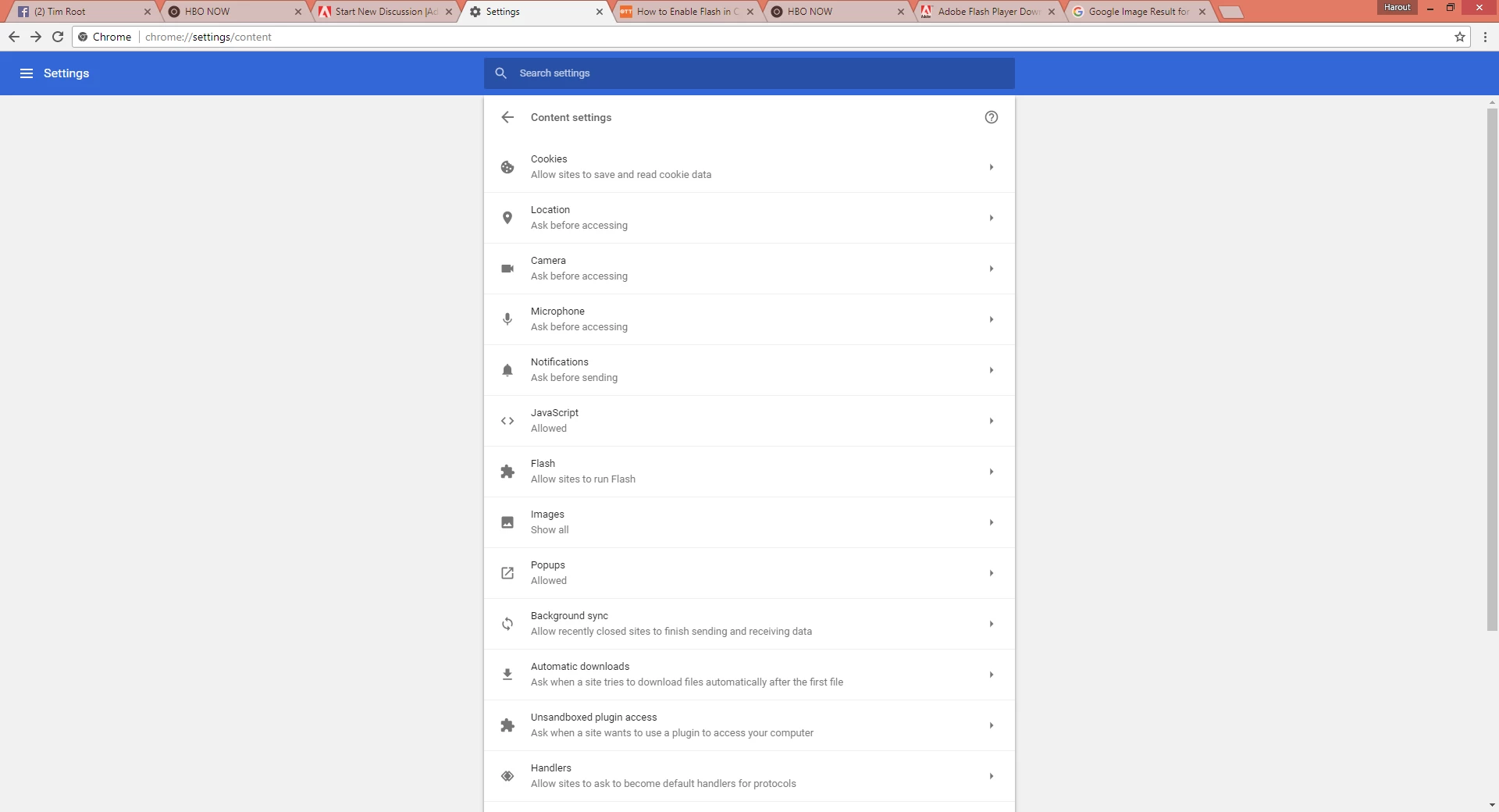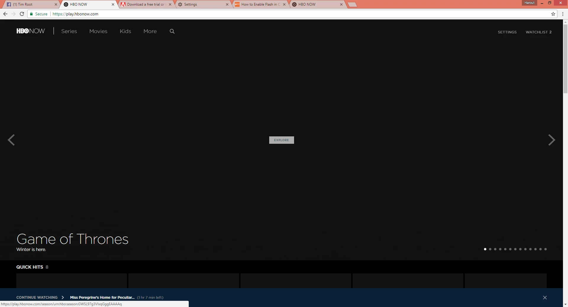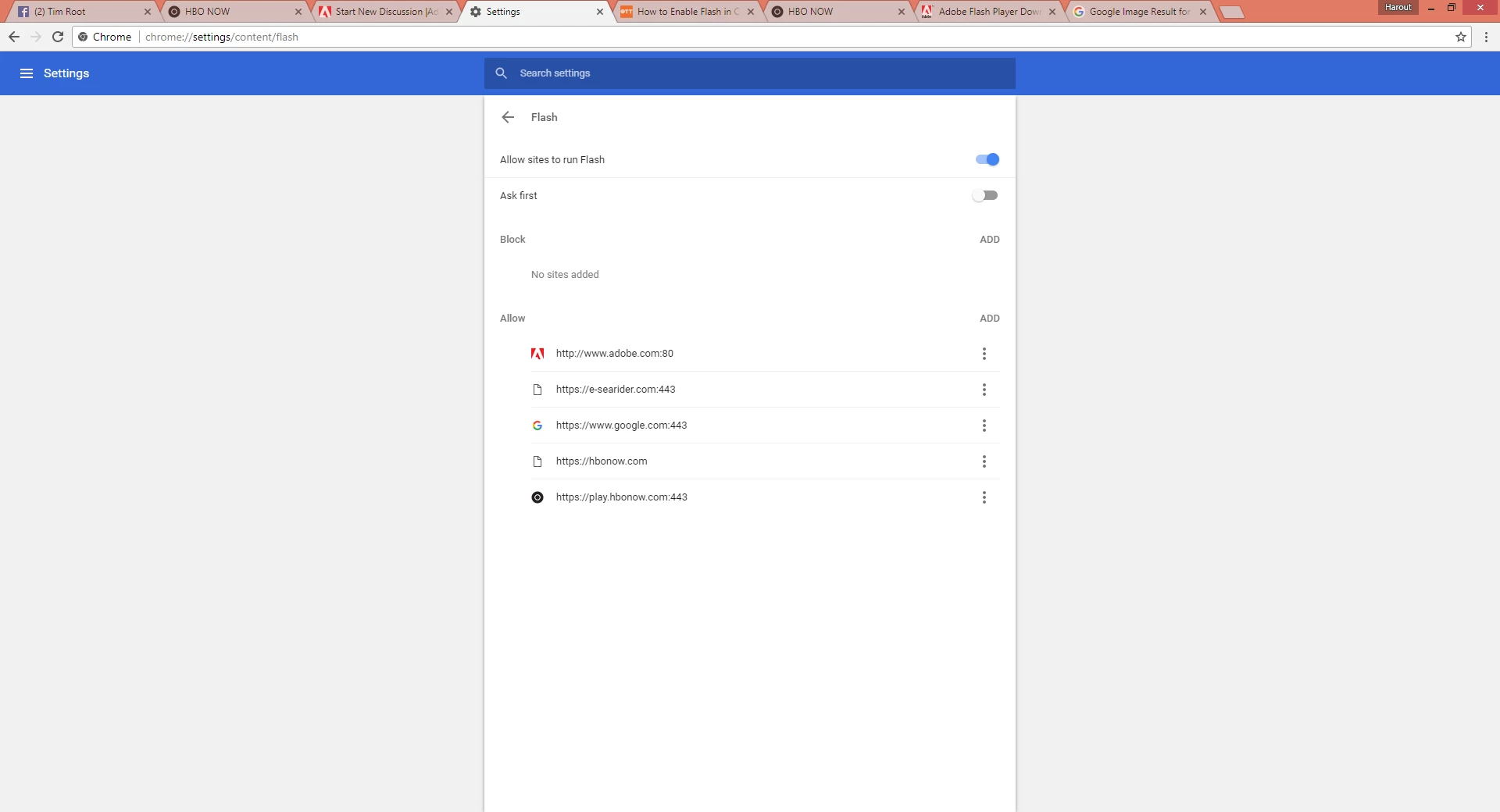 Ok guys. I really need some help here. I can't figure this out at all. HBONOW refuses to help because they say its an Adobe problem, Abobe says its an HBO problem, and all I want to do is be able to watch GoT! I get the same errors on both of my PCs. One is a Windows 8.1 and my laptop is a windows 10 machine. Also, the help that I find online about enabling FLASH in Chrome looks different on my screen.... How do I enable FLASH? I have tried using Chrome, Safari, Firefox, and Explorer...... What am I doing wrong???????