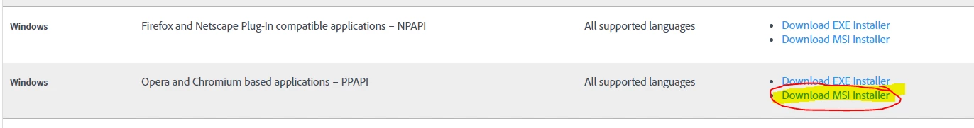 The link to download "Windows Opera and Chromium based applications – PPAPI" msi version is not working .
