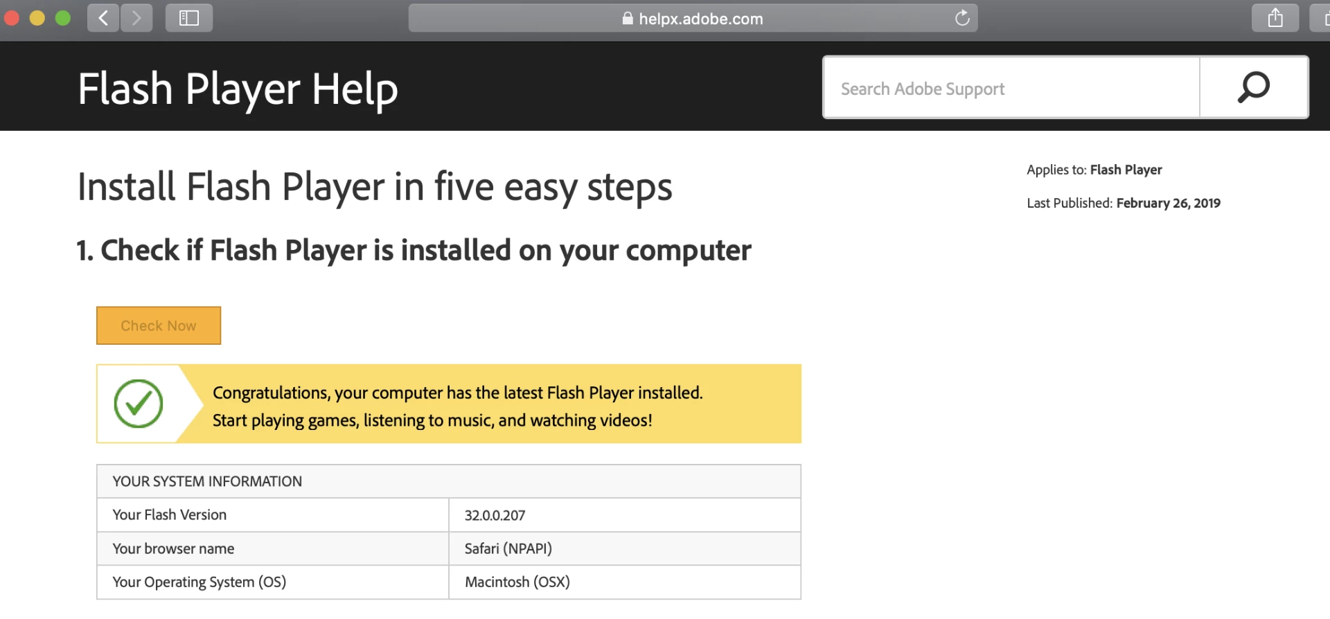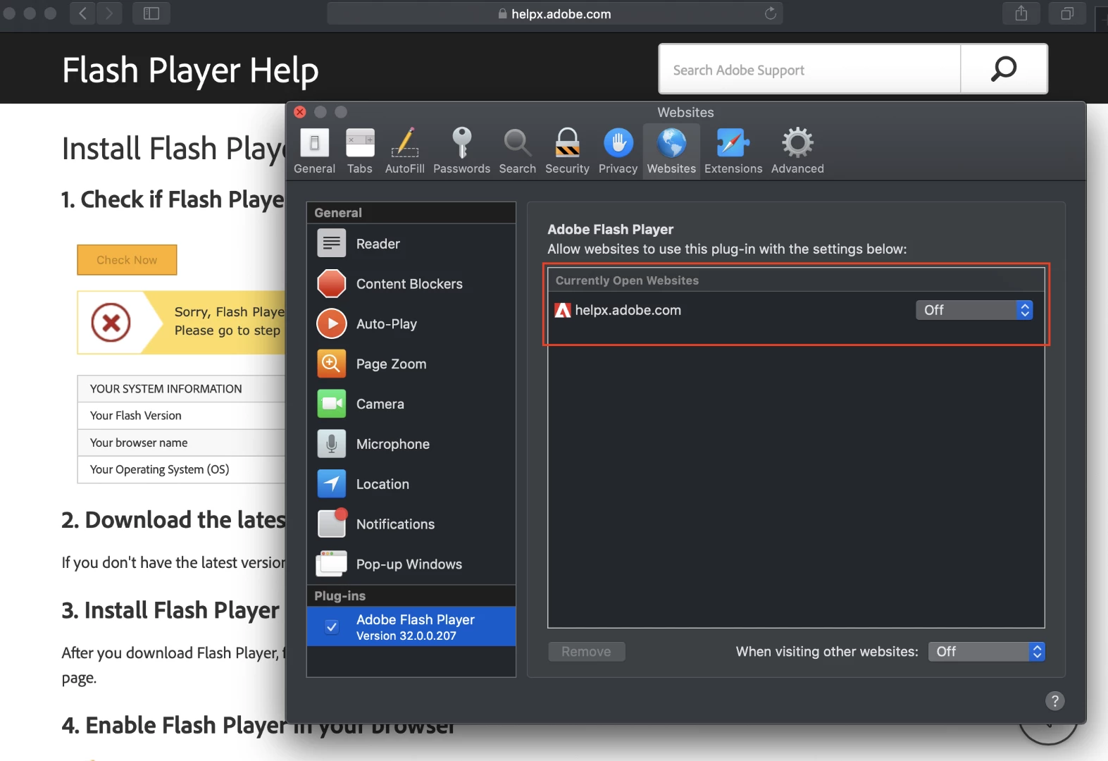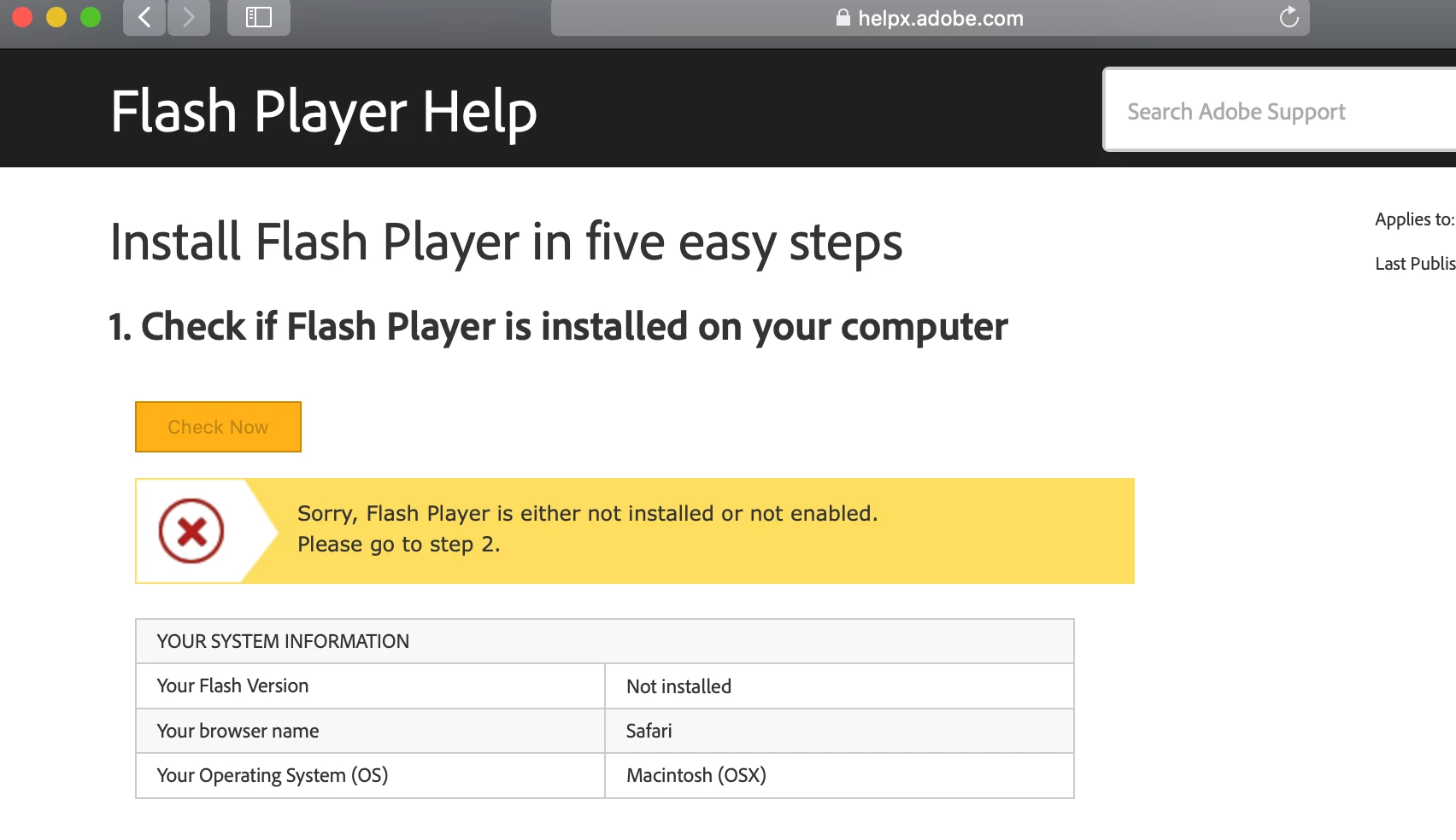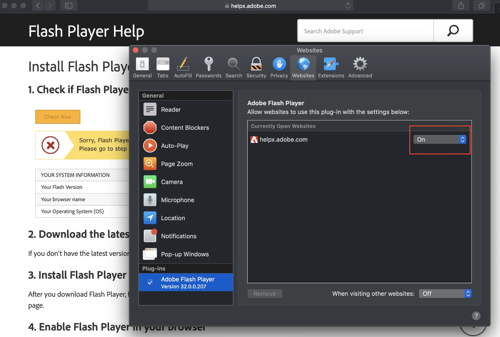 I have a Mac and have uninstalled and reinstalled the current Flash Player app. I've enabled the app on Safari and it shows there, but it does not work or show as installed on your help site or apps where I am trying to use it.