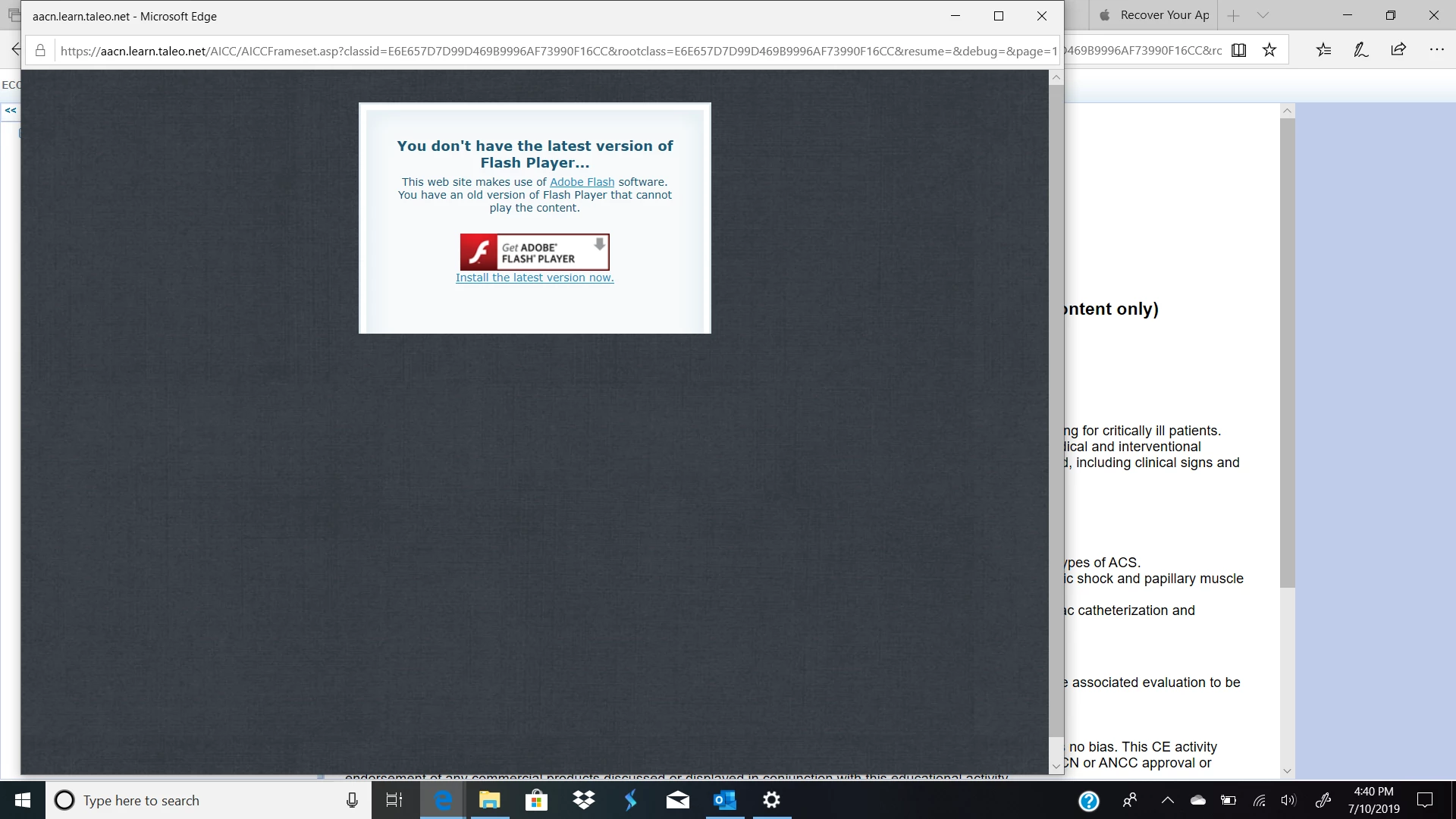 I am trying to launch an education course and every time I do I get this message saying I don't have the latest version of adobe flash player. Then I try and click the link to download it and it pops up and asks if I want to allow it. I say yes and then poof. everything is gone. I tried going to agent chat on adobe and he gave me a link to download it and check if I had it. It ran a scan and said I DO have it. I trouble shot through all the steps and everything appears to be on and working, except I am still not able to launch this course. I'm at a loss.