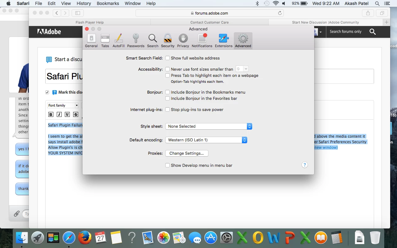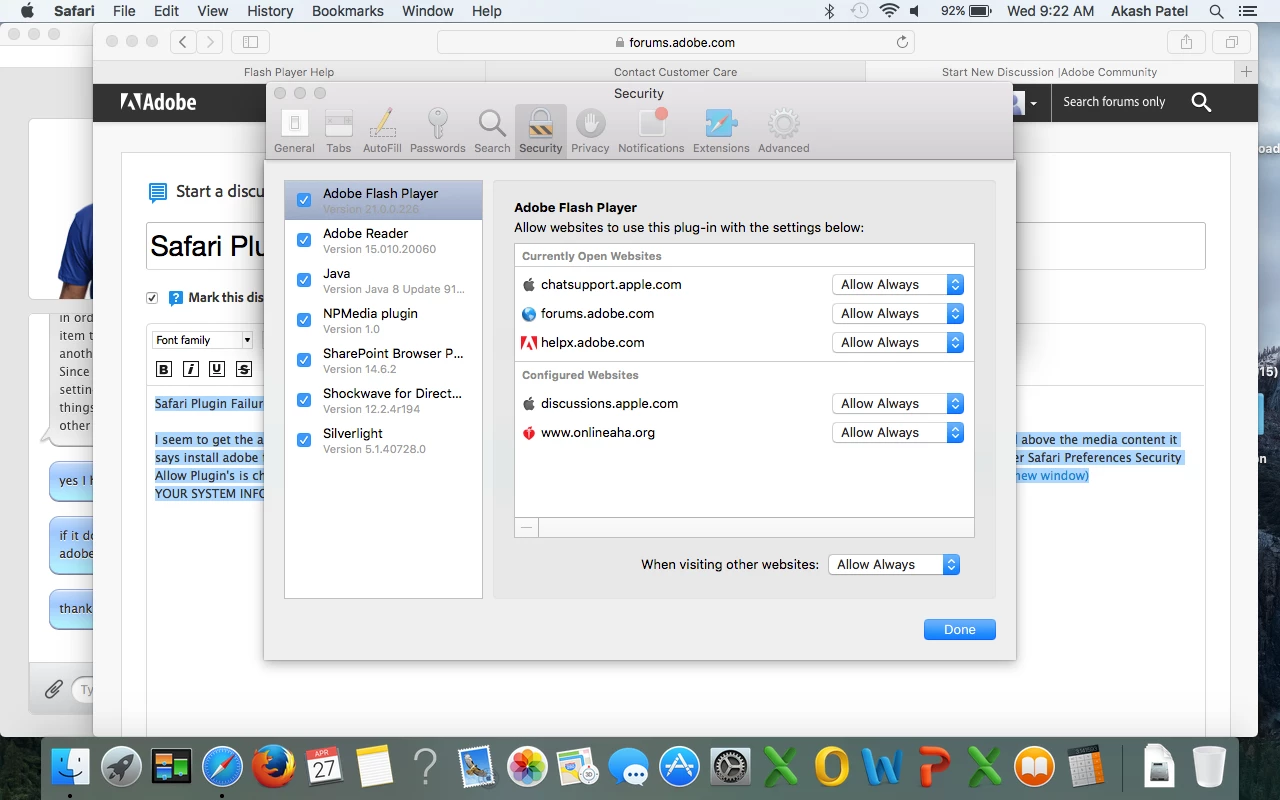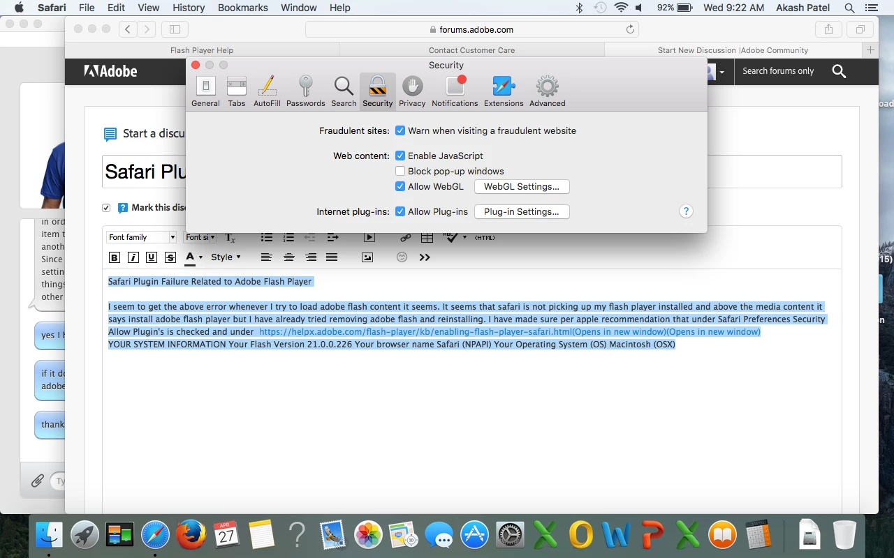 I seem to get the above error whenever I try to load adobe flash content it seems. It seems that safari is not picking up my flash player installed and above the media content it says install adobe flash player but I have already tried removing adobe flash and reinstalling. I have made sure per apple recommendation that under Safari Preferences Security Allow Plugin's is checked and under manage website setting's Allow Always is selected. Under Advanced stop plugin's to save power is not checked. https://helpx.adobe.com/flash-player/kb/enabling-flash-player-safari.html(Opens in new window)(Opens in new window)