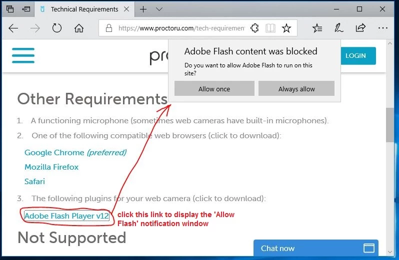 I am running Windows 10 and using the Edge browser to go to the website www.proctoru.com. The website tests my system to see if it will work for a college exam and comes back with Adobe Flash is not installed or blocked. So I check permissions, and I have granted the website www.proctoru.com the ability to run Adobe Flash, I check SETTINGS in Edge like the Adobe website suggests and Adobe Flash is turned ON. There is no puzzle piece in the far right of the address bar for Proctor U's website and there is no splash message on the bottom of the screen that asks to allow anything. Nothing is working yet everything is turned on and given permission to run. Besides downloading a fourth browser to my computer is there anyway to make this program work like it was supposed to?
