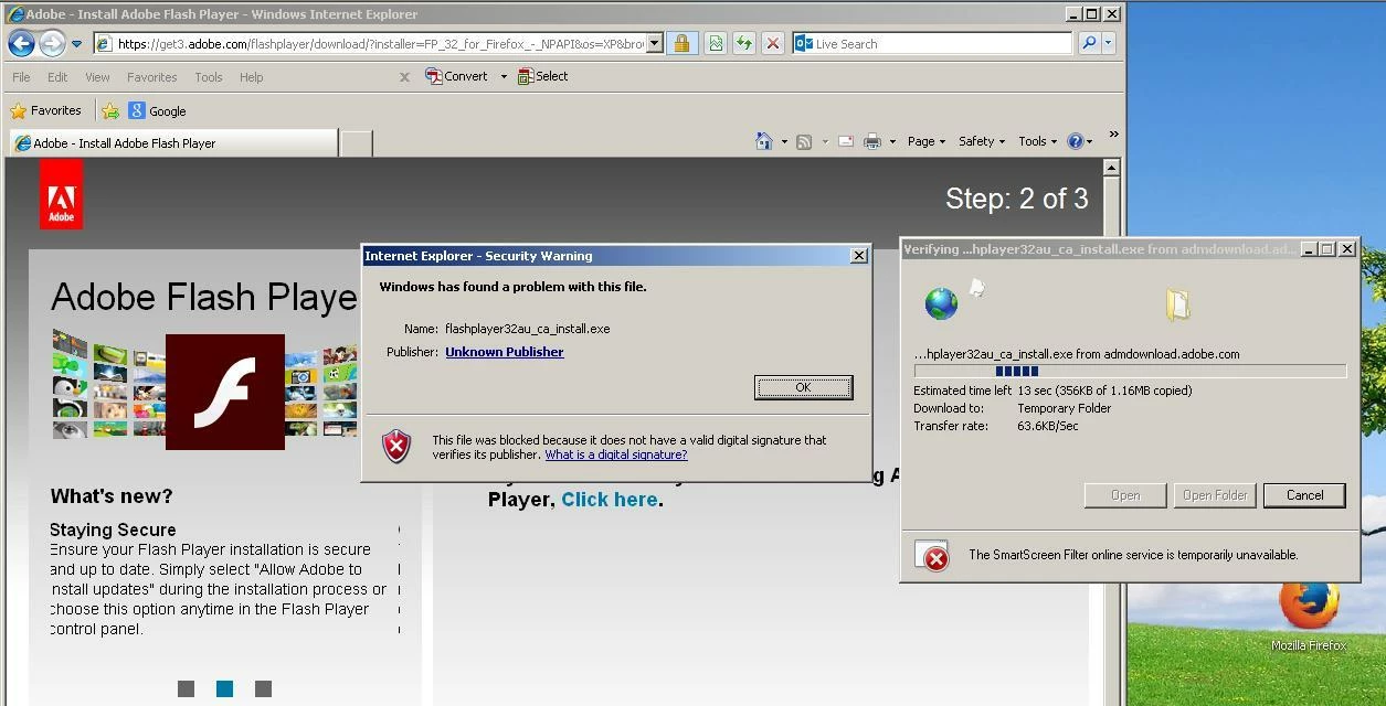 The file creating the problem is flashplayer32au_ca_install.exe. A Google search for it gives no hits but does find flashplayer32au_ha_install.exe. So I'm wondering if someone at Adobe messed up or is someone trying to install malware or what? Does anyone have any ideas?