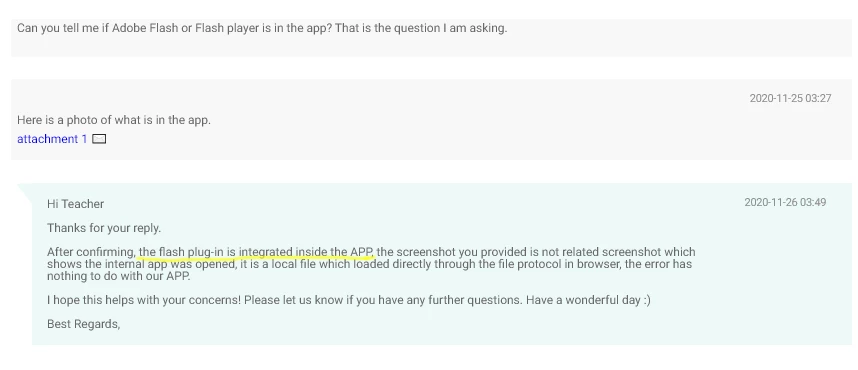 I am one of several hundred thousand people in the United States who is an online English teacher for students in China. To teach, my company requires me to use their app on my Windows 10 computer. I am able to see the files in the app (see attachment). The app contains Adobe Flash Player. Flash Player will still work in mainland China after December 31, 2020. (See attachment.) I assume that because the company I work for is in China, Flash Player will still work on my computer after January 12, 2021, but at an ever-increasing risk to the end users (teachers) because security updates for Flash will end on December 31, 2020.