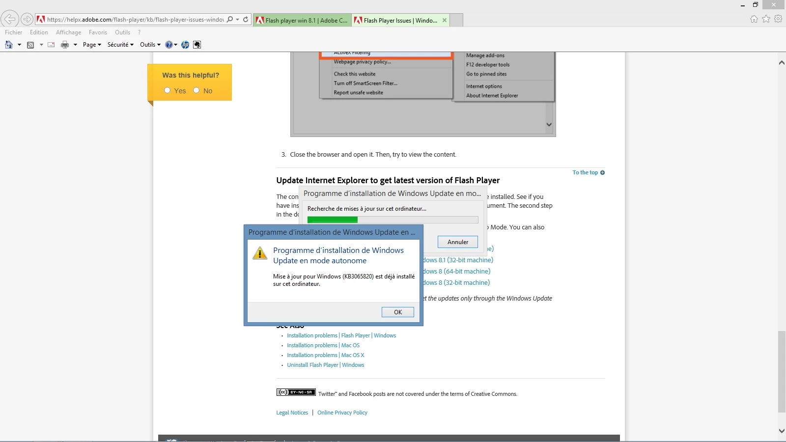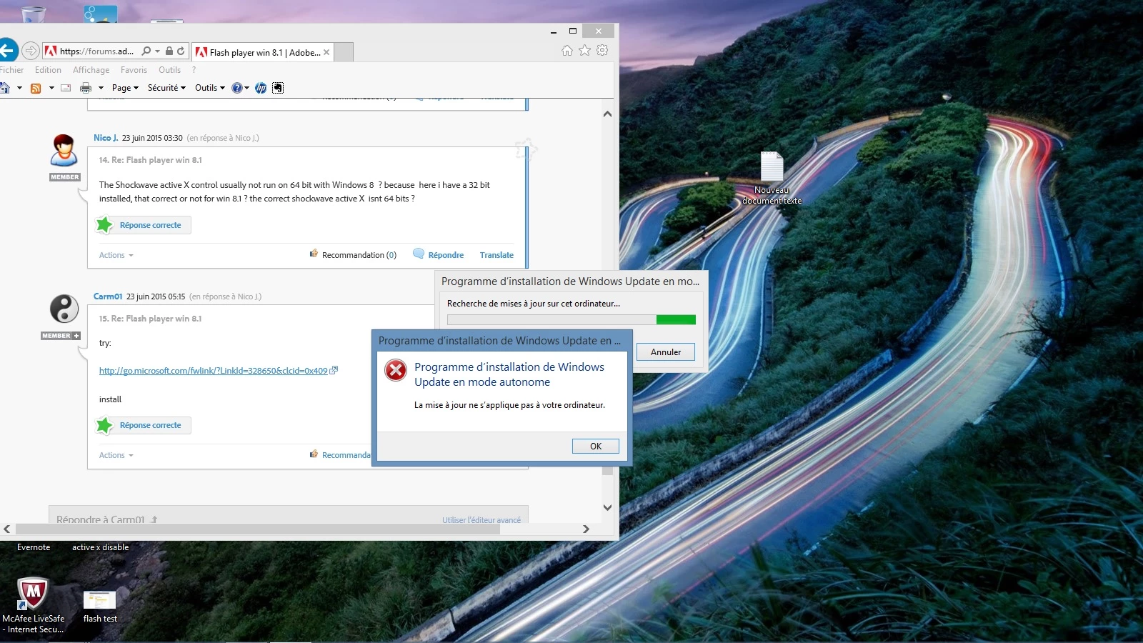 I have a new computer I had try to réinstall flash player after flash player would not run again. (this problem seem to begin after i have try install and uninstall last ad block engine because he wouldnt run, this unrun may be come from anti-virus, avast block run ?!) But at the Add ON Tools (right up explorer corner) shockwave flash object are enabled (and active x off), but when i test flash player at adobe(Problèmes d’installation | Flash Player | Windows i seen this message: