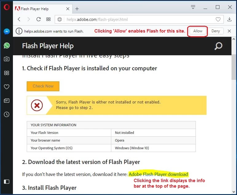 Opera is a fork of Chromium and recently implemented Flash click-to-play, which forces users to 'allow' Flash for each site.  The implementation for this can vary by site.  For example. if you go to https://helpx.adobe.com/flash-player.html and click 'Check Now', the widget may indicate Flash Player is either not installed or not enabled.  Click the 'Adobe Flash Player download' link displays the info bar asking if the user wants to enable Flash for the site: