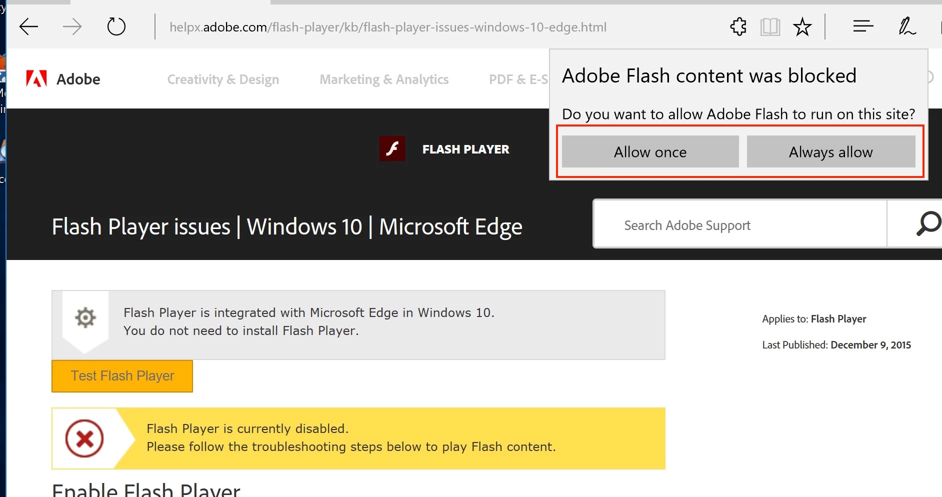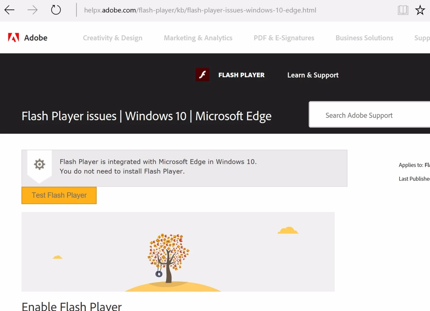 I am running Flash Player on Windows 10 version 1703. I have Microsoft Edge 40.15063.0.0 and I can't get Flash Player to enable. I go to settings and it shows Flash Player as "ON" but when I go to Adobe and test it shows that it is disabled. I don't have a puzzle piece in my address bar nor is there a ‘Download Flash’ or ‘Enable Flash’ link/button. How can I enable flash player.