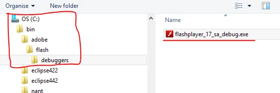 I usually do something like "C:\bin\adobe\flash\debuggers"... it is a bit linux-ish but I like to organize my command-line and stand-alone tools under the c:\bin directory just to keep a tidy house so to speak...
